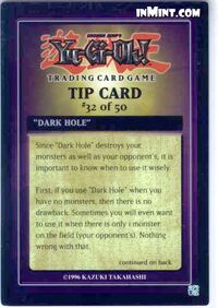 Spell card, dark hole, is limited in advanced format tournament play, and limited in traditional format tournament play. Yugioh began back in the mid 90's as a weekly short in shonen jump by 1999. I did not make these cards. This page notes details of dark hole (spell card/normal) : Destroy all monsters on the field.