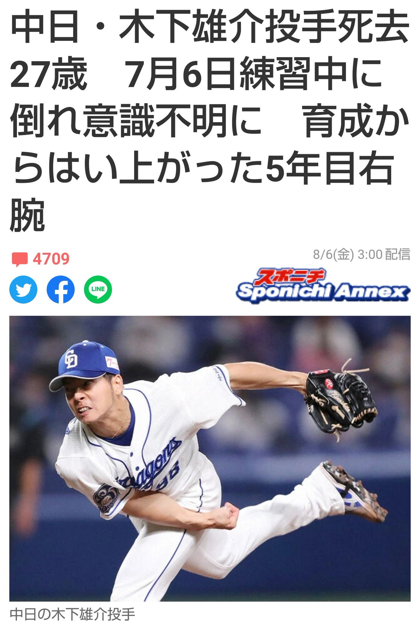 27.98 id:nata+1nzd 木下雄介 17歳 徳島県大会決勝で延長13回サヨナラ負け 19歳 駒大に進学するも肩を故障し中退 20歳 不動産関係の会社に就職 21歳 徳島インディゴソックスに練習生で入団 23歳 中日に育成指名. しかも、このニュースの見出しが 『ワクチン接種後に「重篤」危機』 とあったことで web上では、大騒動 となっています。 与田中日あまりにショック、木下雄介投手27歳急死 死因、病名明かされず 2021年8月6日22時27分 春季キャンプで練習する木下雄介さん(2021年2月7日) 中日は6日、5年目右腕の木下雄介(きのした・ゆうすけ)投手が3日に名古屋市内で死去したと発表した。